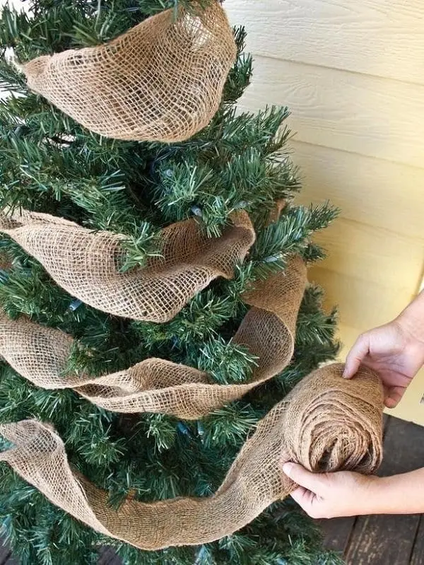 A burlap garland makes a tree look quaint and festive.