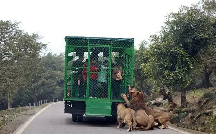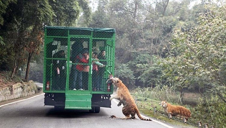 At the Lehe Ledu Wildlife Zoo in Chongqing, China, it’s the humans who are locked behind bars while the animals get to roam around. Visitors can book a tour where they will be locked in a cage in the back of a truck and driven through predators’ enclosures. Raw meat is hung on the sides of the cage, to encourage the animals to come closer. Zoo spokeswoman Chan Liang said,