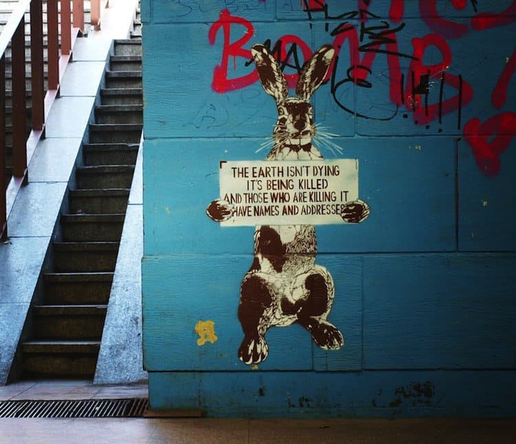 Art can be an effective way of conveying powerful messages. Street art, viewed by such a huge and diverse range of people, is particularly effective when it comes to getting a message across. Using provocative images and simple slogans street artists can easily remind us about important issues and even inspire us to take some sort of action. The images of street art in this post all contain messages to do with the environment. Issues such as climate change and animal rights are tackled with amazing results. Check it out!