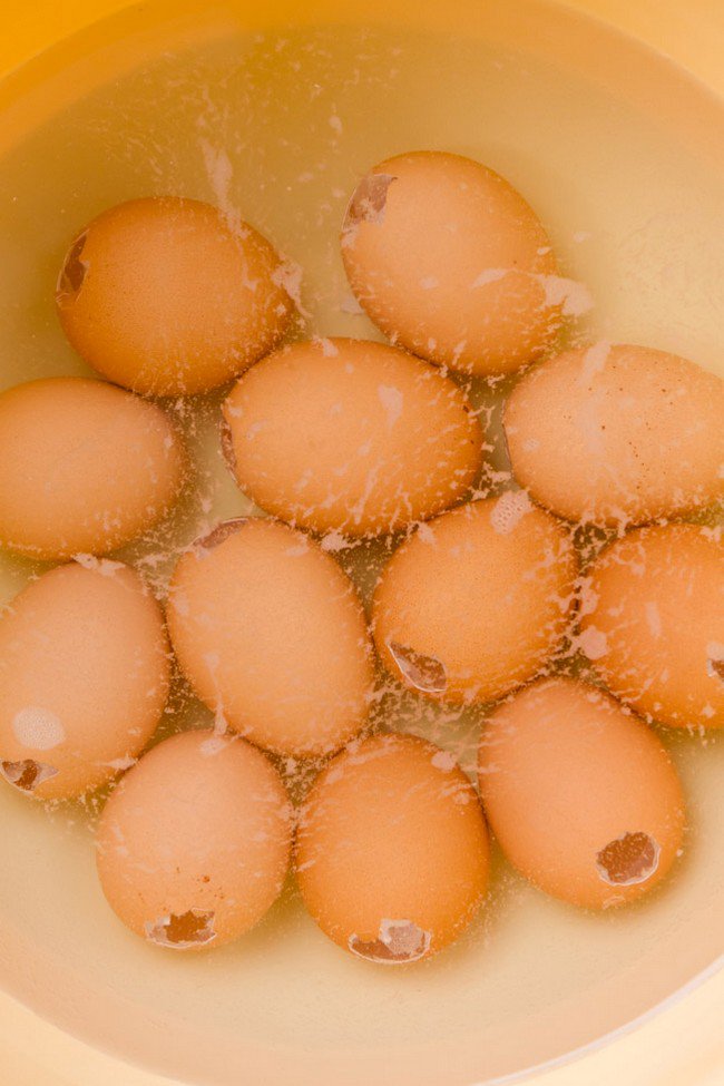 Immerse the eggs in saltwater for 30 minutes after rinsing them out thoroughly under running water. Ensure the eggs sink to the bottom of the bowl to be fully cleaned.