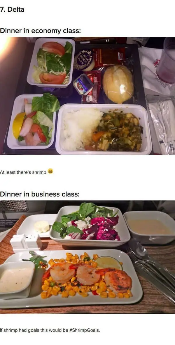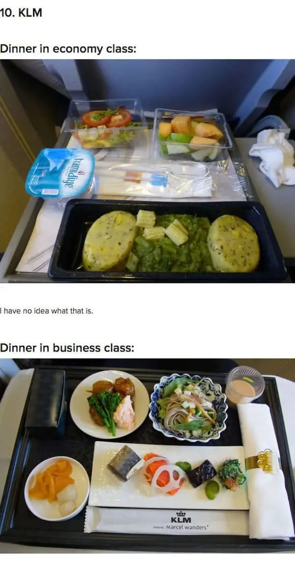 If you’re used to flying in coach, then you’ll know that airplane food isn’t exactly gourmet. However, if you fly business class or first class, you might be surprised at the delicacies they serve up. For most of us, flying first class just isn’t a luxury that we can afford, but it’s just as well, because if you fly first class once, you’ll never want to go back to economy! The food isn’t the only incredible difference, but it’s a good place to start. This list from ‘9GAG’ compares airplane meals in economy and either business or first class over 20 airlines, and the difference is startling!