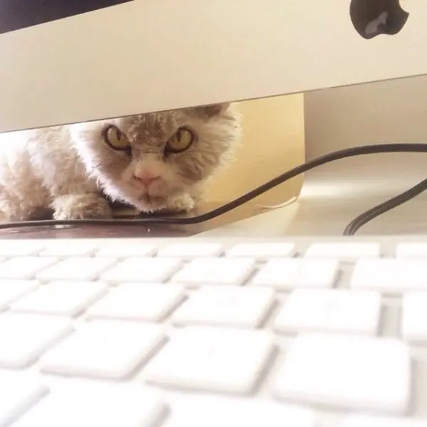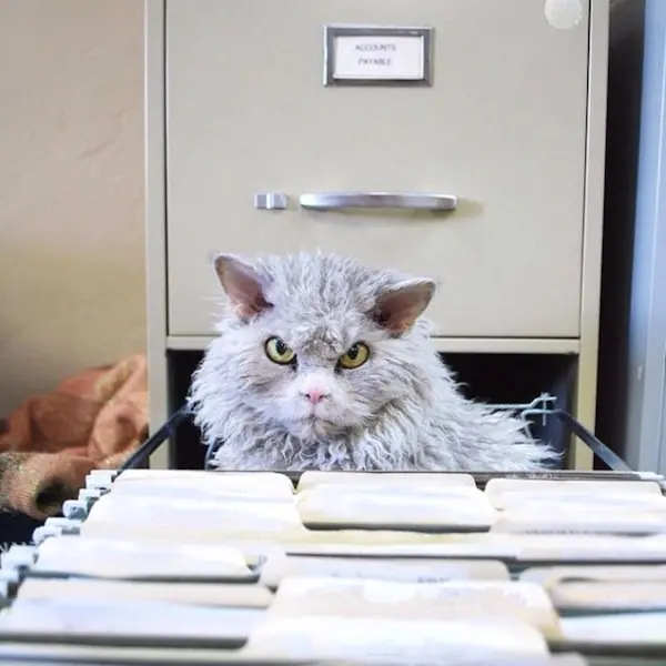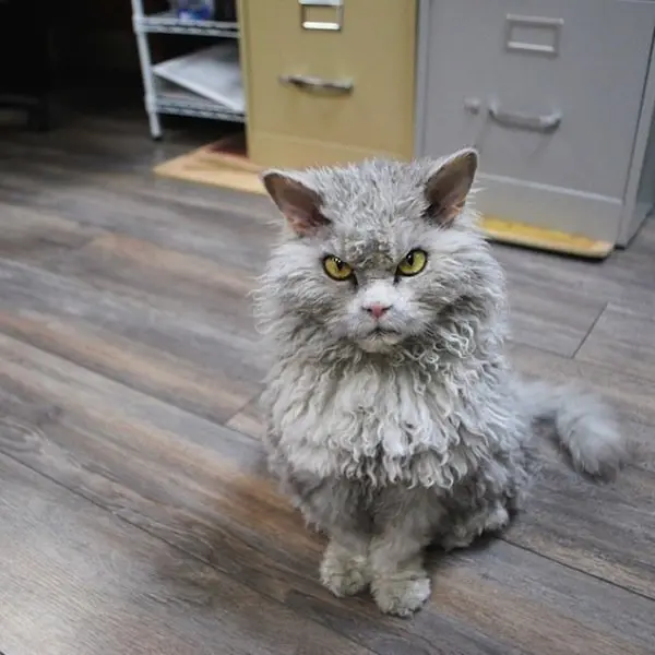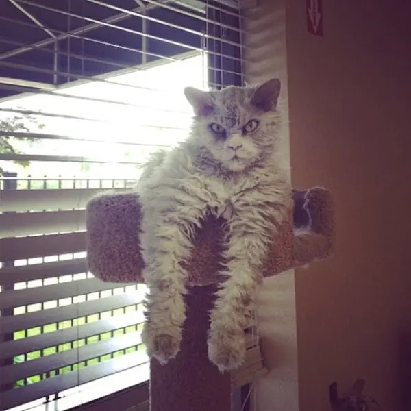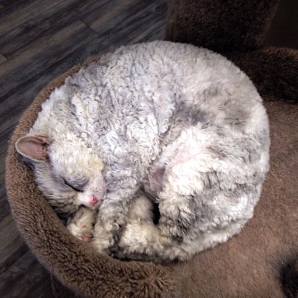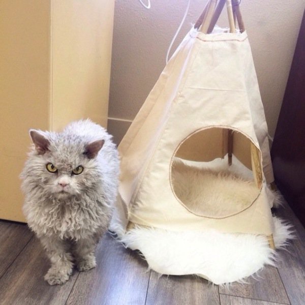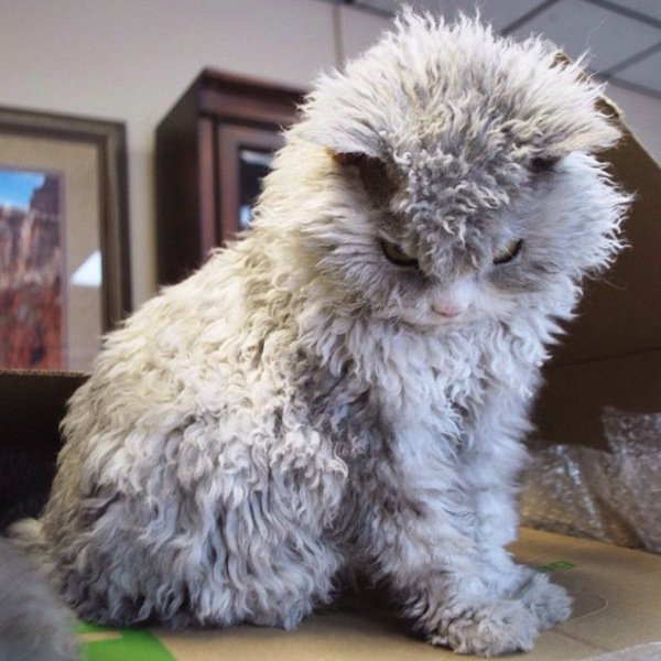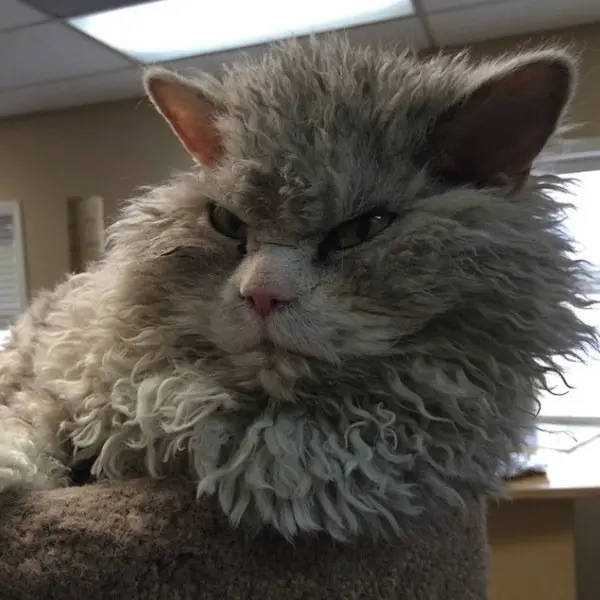 Before you judge him as pompous or angry-looking, you have to understand that's just his natural, resting expression! He can't help it but we think it just adds to his character. Albert is a Selkirk Rex cat, which is why he has such long curls, making him look more than a little sheepish, as well as angry!