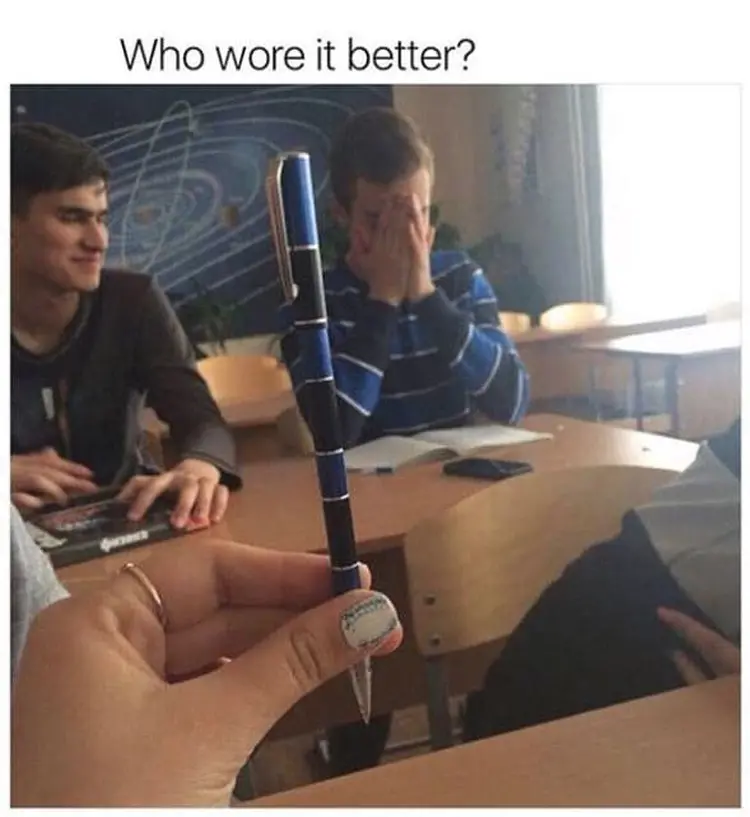 I don’t know which is more humiliating. To come to school just to see a pen wearing the same outfit as yours or to realize that a pen wore it better than you?