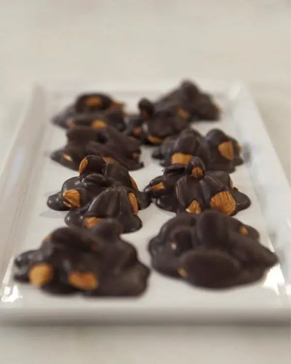 This recipe calls for one and a half cups of almonds and a cup of melted dark chocolate. Instructions here.
