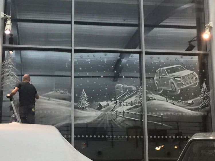Nothing says Christmas better than a beautiful snow scene, especially when it's sprayed on a window. There is something so magical about this frosty art on glass, it is created by 'Snow Windows'. Beginning 8 years ago in Australia, the guy behind the business has now moved back home to the UK where his work is in real demand over the winter months. All the scenes are created freehand using snow spray and a brush! Take a look!