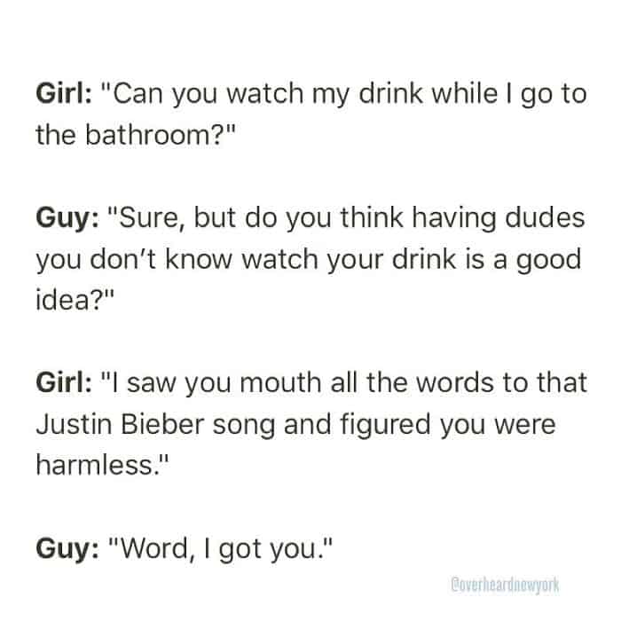 When someone talks about Bieber so much in a bar, it’s less likely that you’ll get roofied by that person.