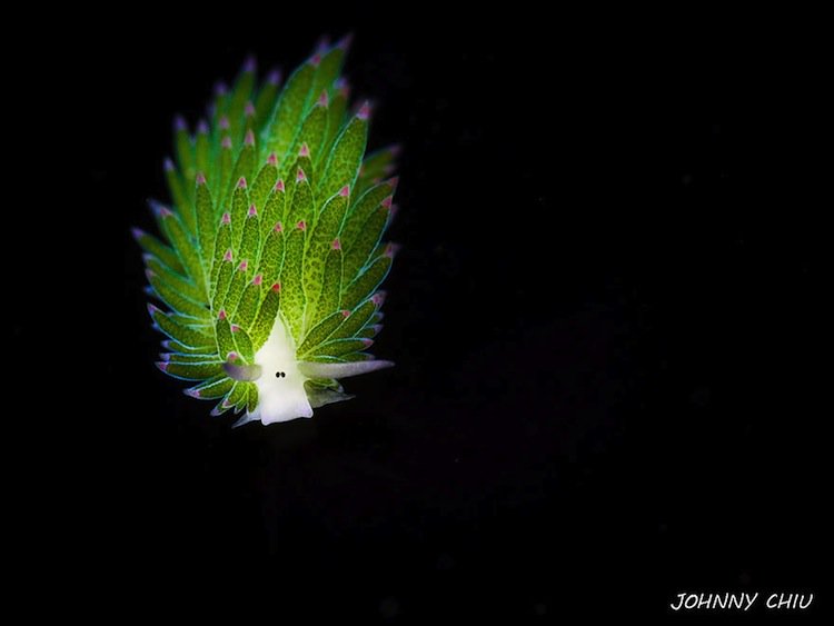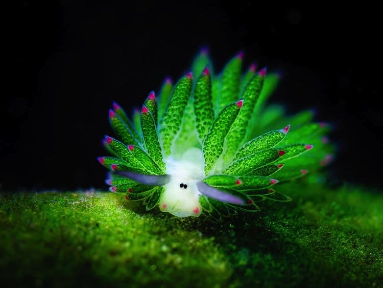 This miniscule sea slug is actually adorably cute! Note, how much it looks like a cartoon sheep, with its beady eyes and adorable little feelers. No wonder people call it the “leaf sheep“. The proper name for this little slug (they grow up to just 5mm in length) is actually Costasiella kuroshimae.