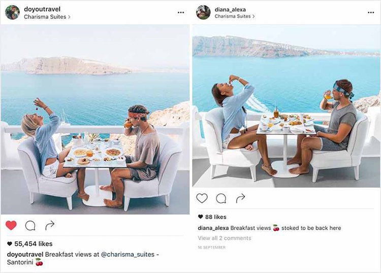 Some people believe that imitation is the highest form of flattery, however, we’re going to guess that couple Jack Morris and Lauren Bullen probably don’t feel that way. The Instagram famous duo are travel photographers that share their idyllic holiday and traveling photos with their 2 million + followers but recently they noticed something rather odd. There is a copycat couple that seem to be following them around the world, not only using near identical scenery and locations but also outfits, captions and poses! Take a look and see if you think this is trolling, jealousy or admiration!