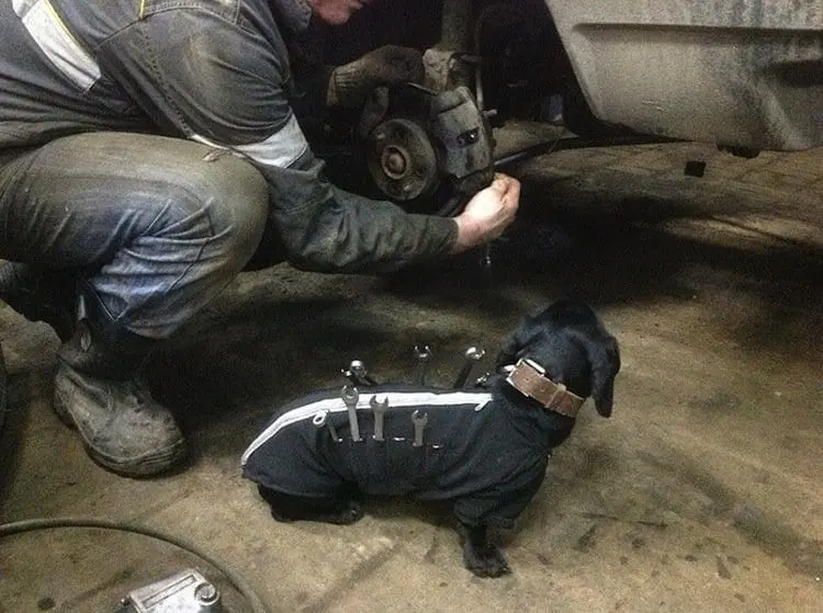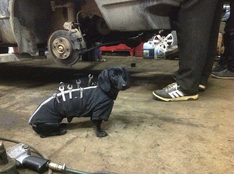 You're about to see photos of what's got to be the cutest mechanic's assistant in the world. And no, we're not talking about a girl next door blonde, but an adorable dog! The dachshund wears a lovely little tailor-made tool belt coat, from which the mechanic can pick and choose his tools. These photos are presumed to have been taken in Russia, as they began going viral on the Russian net. Some people have expressed concerns about the dachshund's weak spine. While the tools in the pictures look light, be warned, never force your dog to carry equipment that is too heavy for it to handle with comfort. Take a look!
