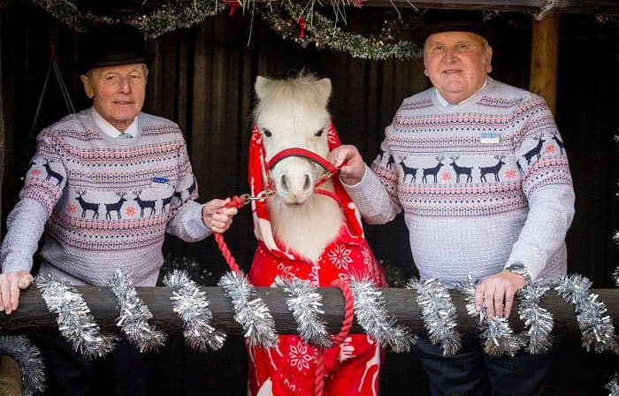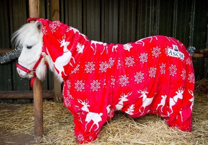 Most people have heard of, or own, a onesie. The full body garment brings us back to childhood, feeling all snuggled and enclosed. Well, now a new fashion-forward design suggests horses can get in on the comfy winter snuggle-suit action, too! Ascot Racecourse recently revealed its new 'foursie' made especially for Shetland pony, Daffy. Festive and cozy, it is hoped that the foursie will keep Daffy warm throughout the cold winter months. Apparently, he's the envy of the entire stable. Take a look!