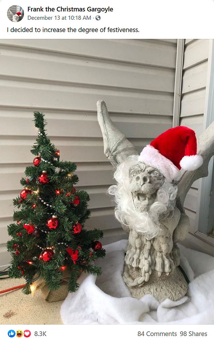 On her Facebook page, she posted a photo of Frank wearing a Santa hat and a white beard to make him look festive. Apparently, she had no plans of taking away the gargoyle from her porch. She also hilariously said that she still likes Frank even if he was unable to ward off evil. As if that’s not enough, she even added a mini Christmas tree next to Frank. Of course, the entitled neighbour didn’t like what she saw and left another note expressing her disappointment. As a response, she added an elf and placed it on Frank’s back along with a reply note saying that the elf is watching.
