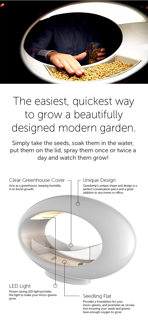 If you don't have the space or time for gardening, but you love to watch things grow, then the 'Grasslamp' could be for you. Available in black or white, this stylish table lamp doubles up as a mini greenhouse in which you can grow a number of plants, such as wheatgrass, which cats love, and edible microgreens, without even the need for soil. All you do is soak the seeds in water, place them in the bottom of the lamp, put the greenhouse lid on and away you go! They do need to be watered once or twice a day, but in general the whole process is fairly low maintenance. The project is currently being funded by 'Kickstarter', so if you'd love to have one in your home or office, get over there and donate! Take a look!