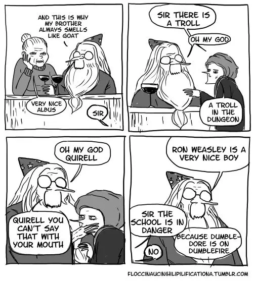 In the Harry Potter books, Professor Dumbledore, Headmaster of Hogwarts, is seen as a kind, wise and fair man. However, these hilarious comic strips from Tumblr user 'floccinaucinihilipilification' might make you think otherwise. Their version of Dumbledore is thoughtless, irresponsible and a bit mean. Dumbleburn! Okay, so nothing's going to take away our idealized view of the real Dumbledore, but these cartoons are still very funny. Everyone has their dark side, but this Dumbledore has more of one than most! So, if you want to see a version of the beloved headmaster who likes to make jokes, insult people and has no qualms about dropping a baby, then read on. Ten points to Gryffindor!
