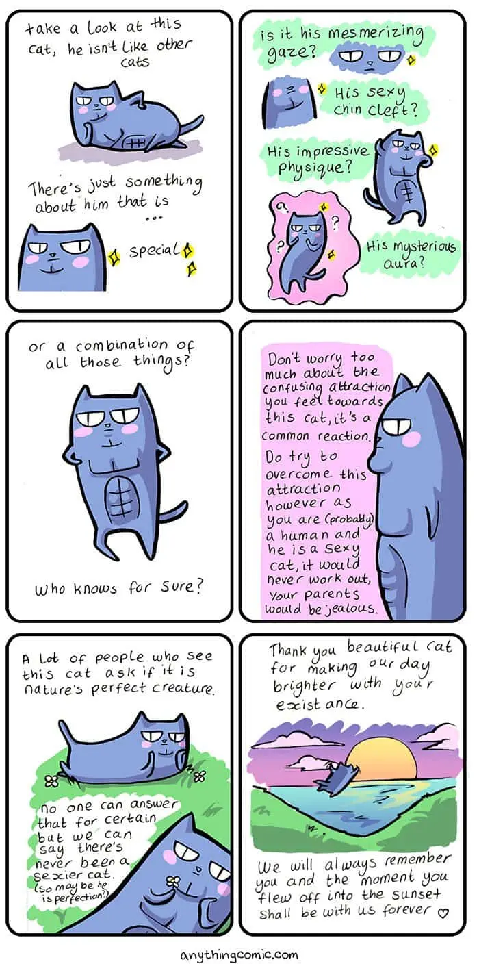 Hopefully, you have already seen the first part of this post based on comics that hilariously sum up living with cats! If you have, we're sure that you've been smiling, if not laughing, at the charming and accurate works of talented UK artist Kelly Angel. It's funny how even though each cat will have a different personality, there are universal traits and annoying things that they all seem to have and do! However, we love them none the less and those annoying habits are actually things we would probably miss if they stopped. Take a look below at more of Kelly's work and don't forget to check our her website by clicking the link below!