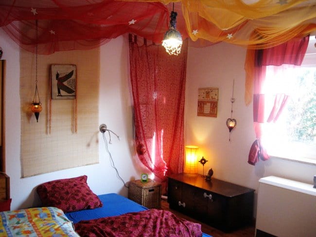 If you’re lacking a headboard, you can still dress up the space! A decorative sheet and some fairy lights looks wonderful!