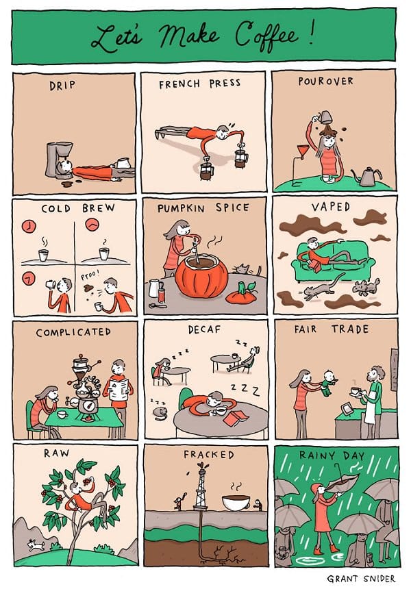 If you're anything like us, coffee is one of the only reasons to get out of bed in the morning. Even just a few years ago, in most households you had your basic coffee pot, instant coffee, or nothing. But, now different ways of making coffee have come to the mainstream, and most people have some gadget or fancy method for making the perfect cup of joe. Grant Snider, from 'Incidental Comics', has drawn this hilarious cartoon strip which offers a humorous take on the different ways to make coffee, as well as different types of coffee. For instance, if you want fair trade coffee, how about trading your baby for a coffee? Yup, that seems like a fair trade! Let's take a look!