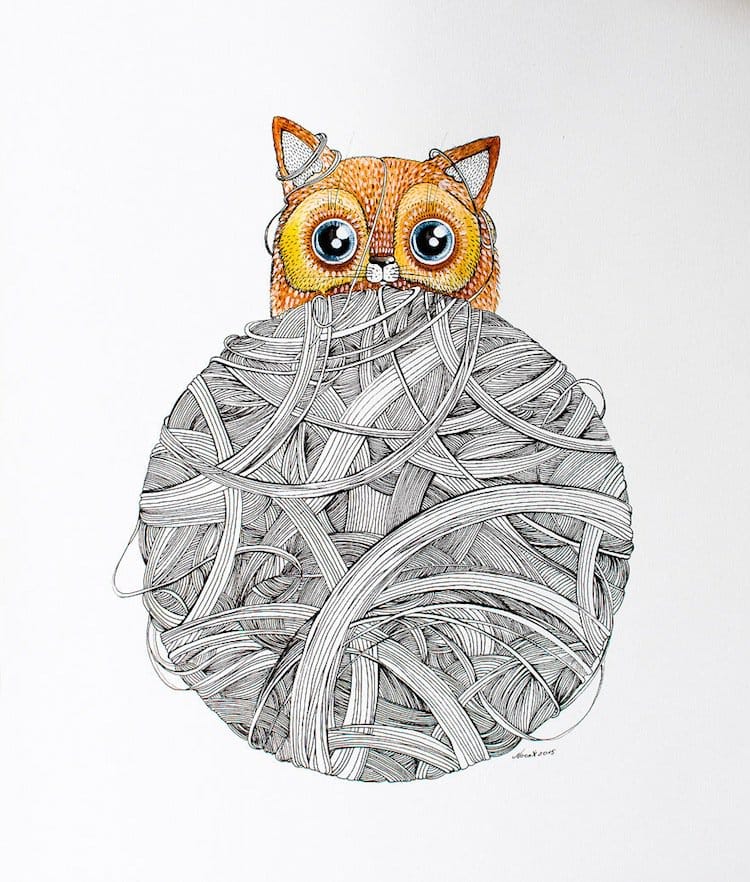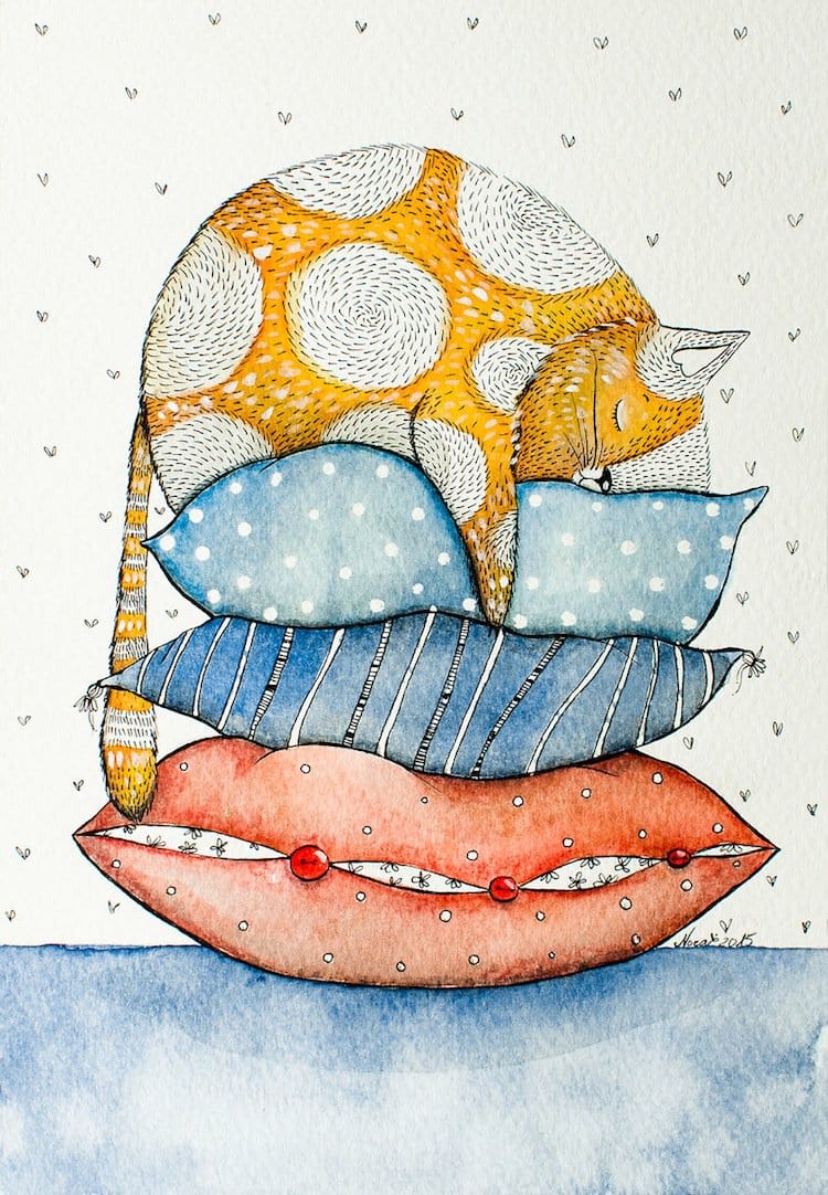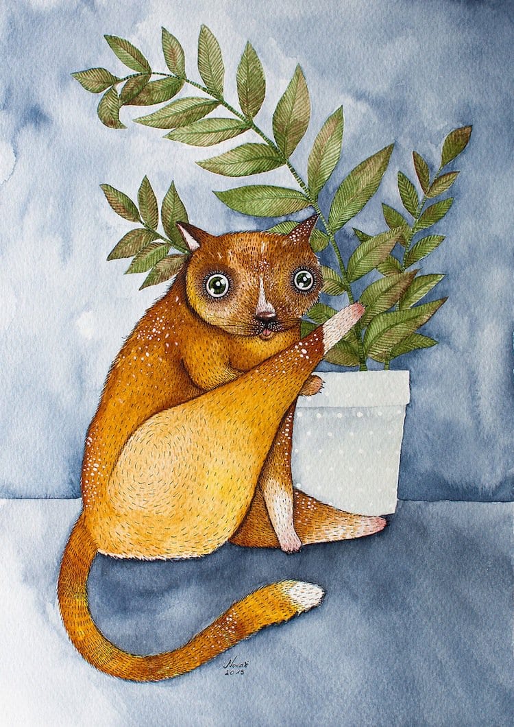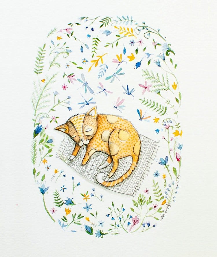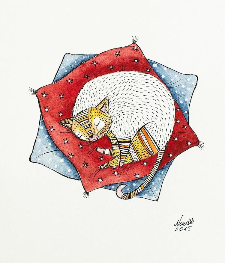 Cat lovers will adore these gorgeous kitty portraits done in watercolor and ink by Lithuanian artist Norvile Dovidonyte, a.k.a Nora. The painter, from Vilnius, says on 'BoredPanda' that she absolutely adores felines. "I love their shiny big eyes, their quirky personalities, and their weird expressions on faces. Anyone who has a cat knows how funny, strange or cute they can be." Nora has an etsy shop that you can check out here. In the meantime, take a look at some of her favorite cats below. She was inspired by her own moggy, Elvis, the big ginger in the last picture. Take a look!