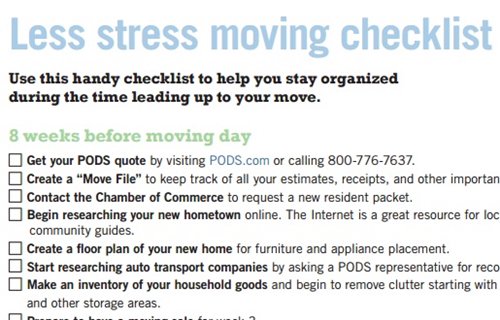 Make a checklist well in advance of your move. It should cover things to do not just on your moving day, but in the preceding days and weeks.