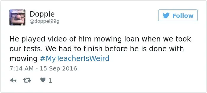 When you’re a little kid you think that teachers, and other grownups, are all sensible, rational people who do stuff like knitting and sudoku in their spare time. However, as you get older, you realize that teachers are human too, and they’re just as odd as the rest of us! Some are better than hiding it than others, though, and we bet you’ve had one or two standout examples of bizarre teachers over the years. To share their own stories, people took to Twitter using the hashtag #MyTeacherIsWeird, and we’ve collected some of the funniest. So, check out these thirteen Tweets to prove that teachers are weird!
