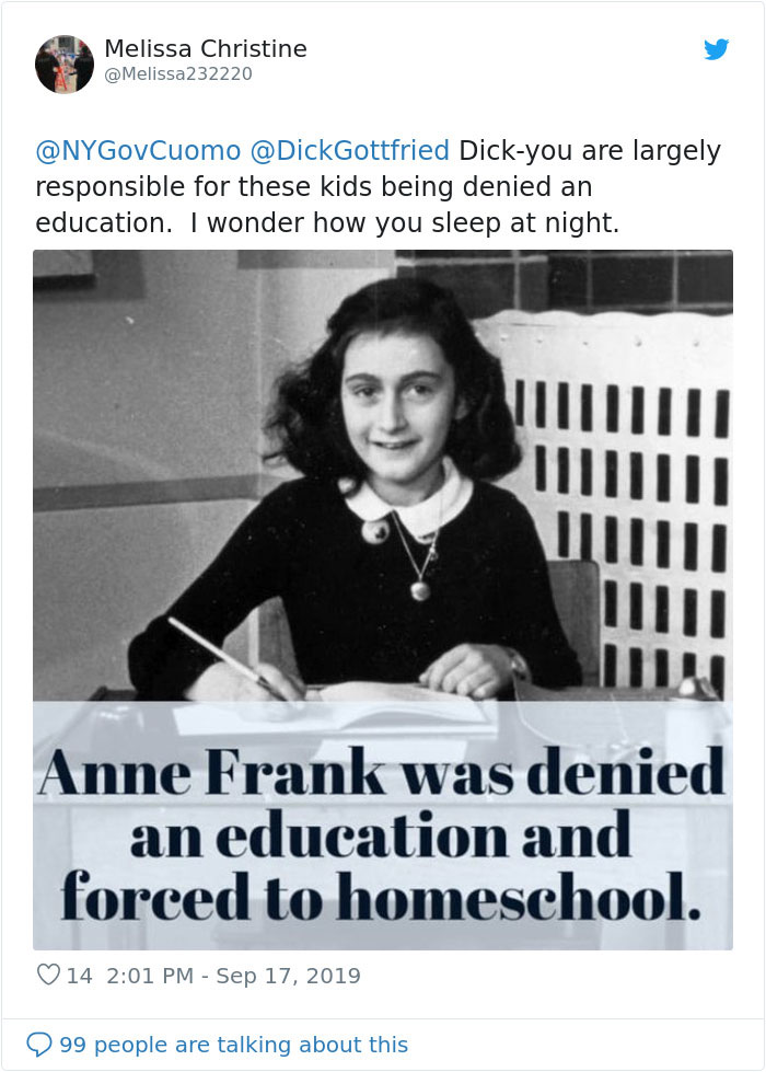 Another furious parent likened these children’s situation to Anne Frank who was “denied an education and forced to homeschool,”