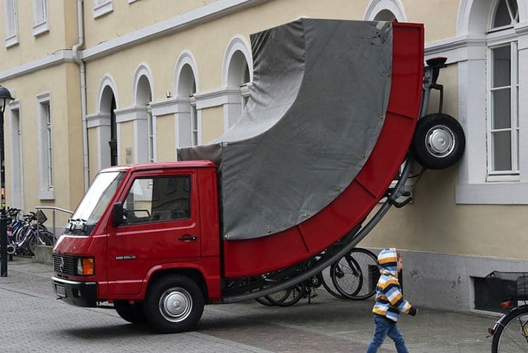 Parking officers in the German city of Karlsruhe got a bit heavy and serious recently, slapping a 30 euro parking ticket on a cool art installation. The installation, by Austrian artist Erwin Wurm, takes the form of a bent red Mercedes MB100D truck, its rear end sloping up a wall. Wurm is famous for his bent vehicle pieces and he had been commissioned to create this one in celebration of the city's 300th birthday celebrations. The artist says the truck was distorted into its unusual shape to show the "mundane from a different perspective". There's nothing more mundane than getting a parking ticket! We hope Wurm gets off the fine upon appeal!