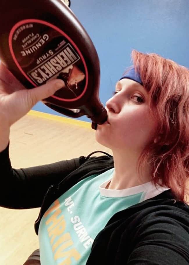 Taking a water-filled Hershey’s syrup bottle to the gym inspires some rather confused looks!