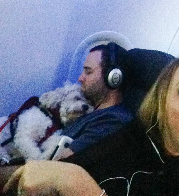 “This guy and his dog on my flight right now. They have been like this for over 2 hours”