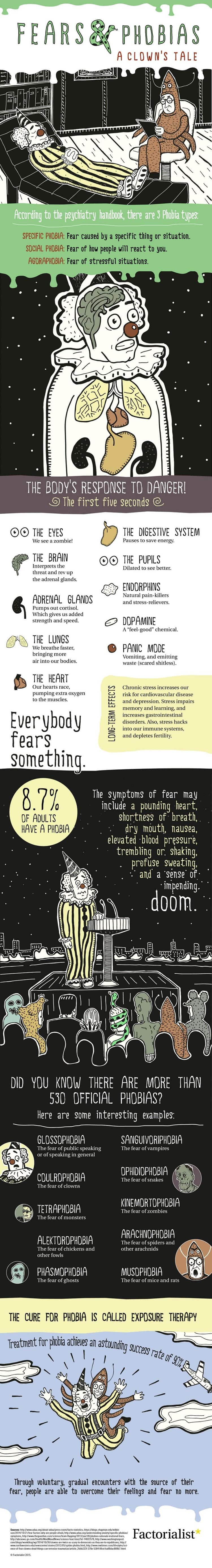 If you've ever wanted to know more about fears and phobias, then you've come to the right place! Anyone who has ever experienced the 'fight or flight' response as a reaction to something they perceived to be scary, or potentially dangerous, will know that it's a funny old feeling, but why does it happen? This infographic from the folks over at 'Factorialist' lays out the physical reactions that your body has when faced with fear. It also talks a little bit about the three different types of phobias, as well as naming some of the 530 official specific phobias, including arachnophobia (something many of us suffer from) and alektrophobia, which is a fear of chickens and other fowl (this one's not so common!). If you want to know more, then be sure to read on!