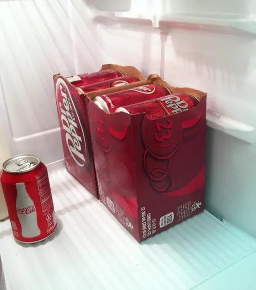 Cutting soda containers in half gives easy access and makes them fit into your fridge better too. Win!
