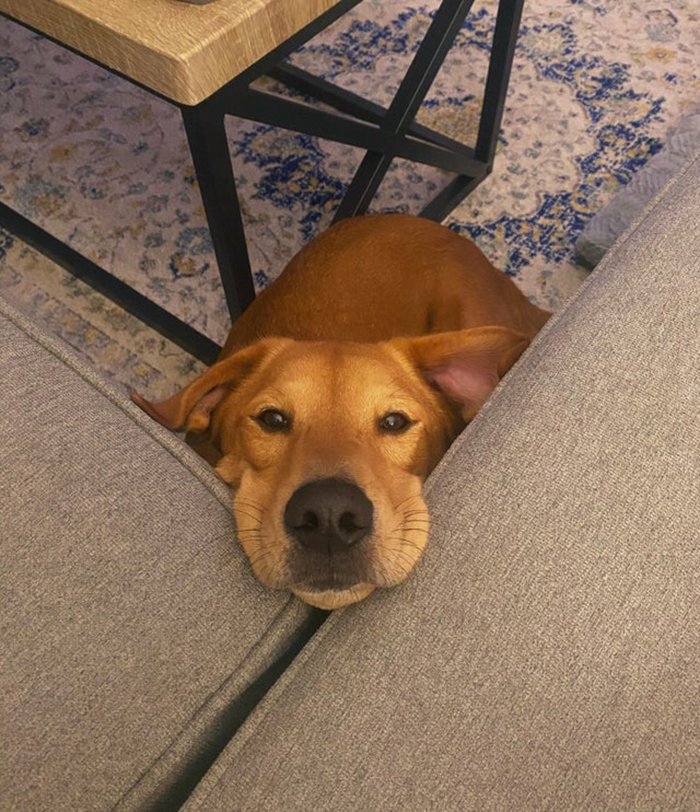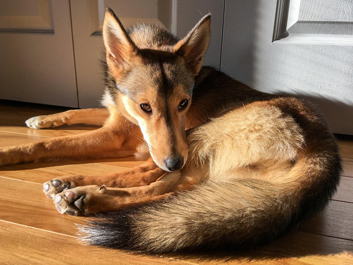“Our newly adopted dog has already found her favorite spot in the morning sun!”