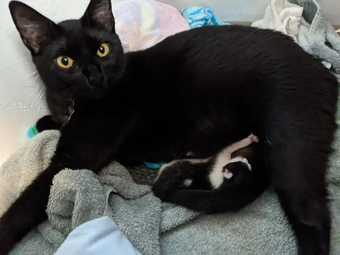 “Stray momma kitty brings her babies to the nice lady who had been feeding her. All kitties were taken in and adopted!”