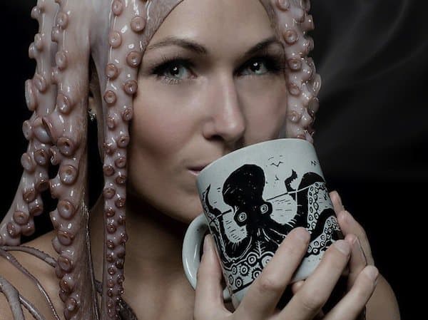 Would you pose with a real (dead!) octopus on your head, for love? Well, this lady would. In fact, she did, and you can see the rather freaky results in the images below! The woman is the fiancee of a guy called Joe Hodnicki, who's the creator of a prototype oceanic-themed drinking mug called, 'The Kraken Mug'. Hodnicki, who explains on his website, has always loved the ocean, as well as art and design. He is currently raising funds for his mug project on Kickstarter. What do you think? Take a look!