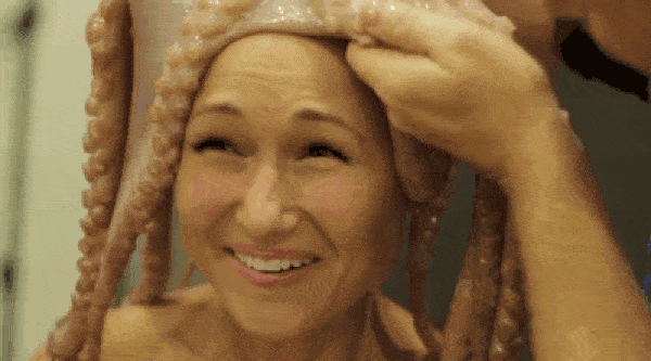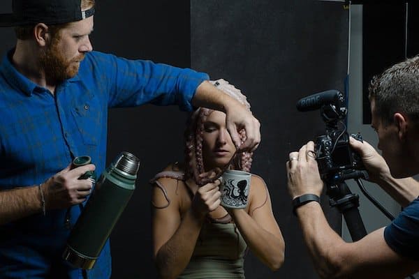 Behind the scenes with an octopus on her head, poor lady!