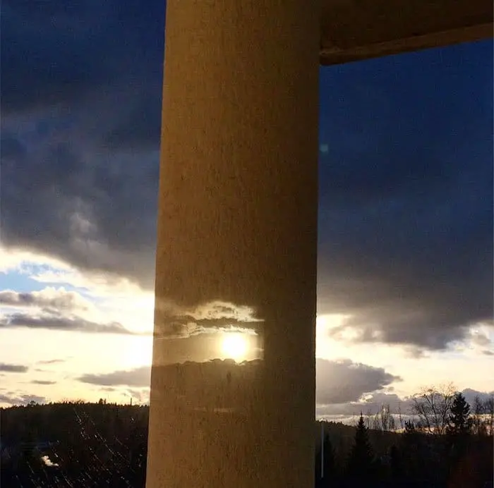 The image reflected from a double glazed window is perfectly aligned with the real image of the sun and clouds behind the pillar!