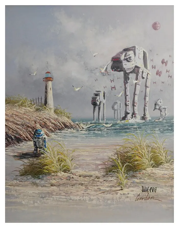 One painting features TIE fighters scaring off some ducks in the wild. Meanwhile, another piece shows Master Yoda awaiting the arrival of Luke Skywalker who’s aboard the X-wing. There’s also one artwork that portrays R2-D2 facing off against an approaching fleet of the Galactic Empire’s battle vehicles.