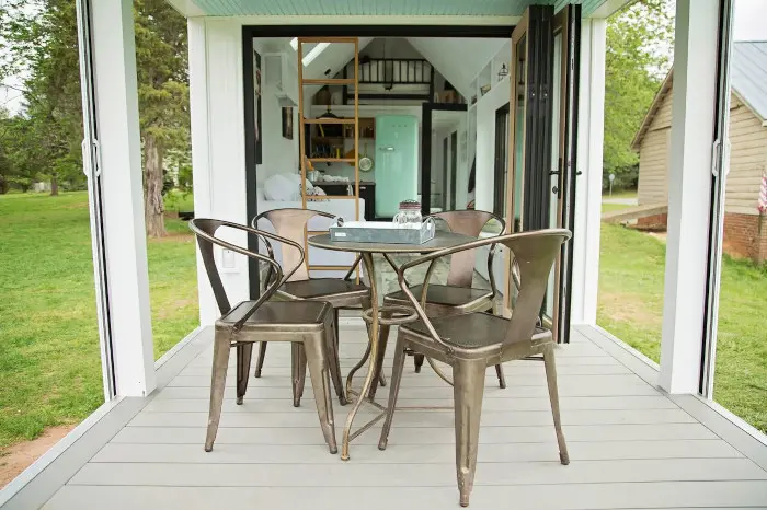 From the outside, Perch & Nest’s Roost36 in NC looks very much like a cozy house with large windows and a porch. The entire unit measures 36-feet long, 8.5-feet wide and 13.5-feet tall. Johanna, in the tour video, shared that the porch measures 8-feet and comes with retractable screens to keep summer insects like mosquitoes at bay. It’s decked with cedar, and already comes with a coffee table set where you can enjoy your morning cup or sip your cocktails in the evening. The screened porch is accessible through a panoramic door/wall that folds completely so you can fully enjoy the view of your getaway’s location.