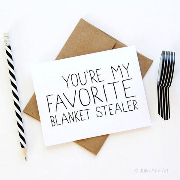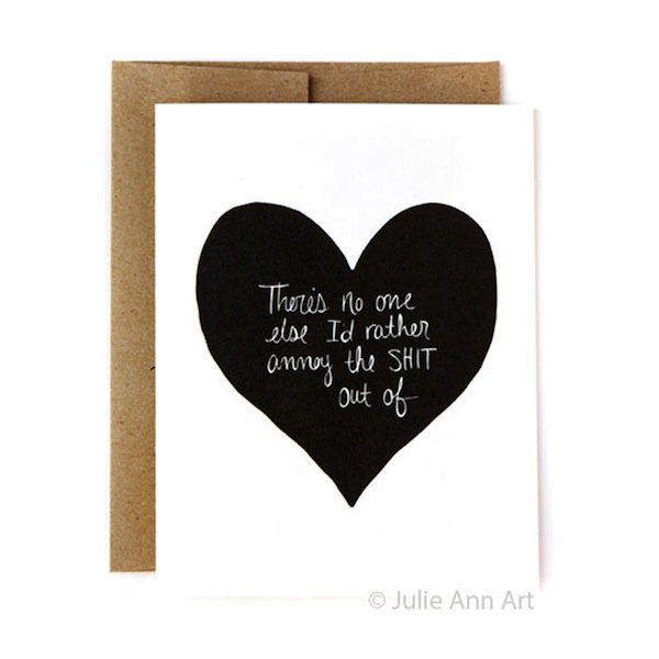 Valentine's Day is the most romantic day of the year… yeah, whatever! For many of us, Valentine's Day is really just another commercialized celebration that we are, pretty much, forced into celebrating, encouraged to spend, spend, spend, and spend some more! Luckily for many couples, fancy presents are not expected, and a simple card will suffice. If you and your partner have been together a while, are comfortable with each other, or simply have a great sense of humor, then you are bound to find the below 15 cards hilariously appropriate! They're by Los Angeles artist Julie Ann, who sells them via her etsy store! Take a look!