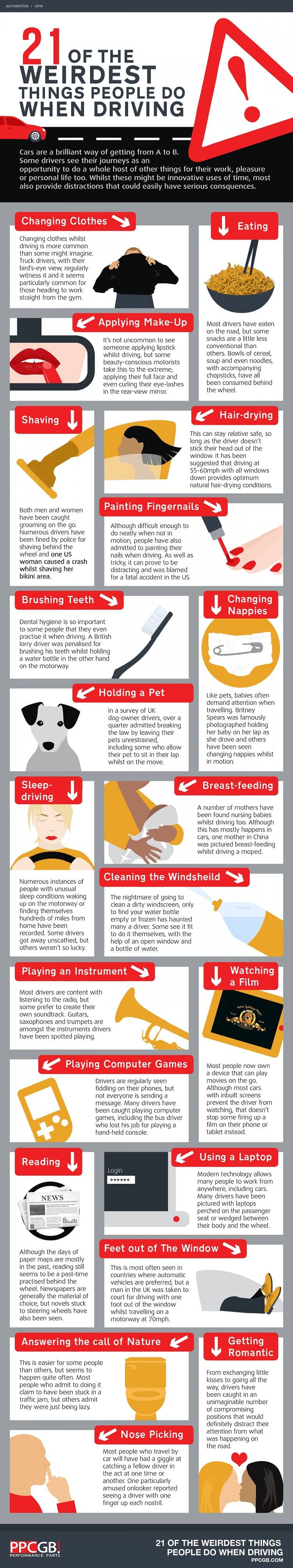 Except for walking, driving is probably the most common way of getting around in this day and age. We all know about the perils of texting or even just talking on the phone while driving, and there are plenty of campaigns urging people to stop doing it. But these campaigns might be missing some of the more unusual things that some people do while driving, many of which could be equally dangerous. So 'PPCGB', a car parts specialist, put together this illuminating infographic showing us 21 of the weirdest things that people do whilst driving. And, some of them are really out there! If you're guilty of doing any of these things while you drive, you should really consider stopping for your own safety and the safety of others on the road. Check it out!