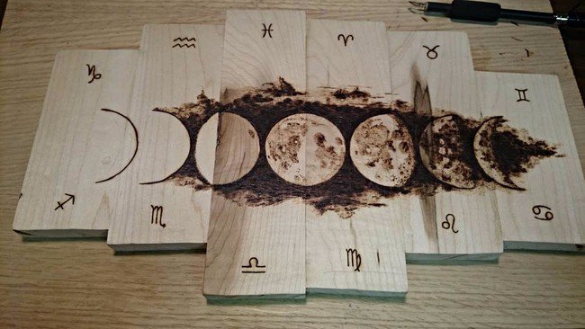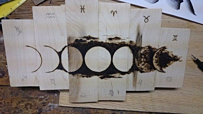 Following that, he used a wood burning pen to define the shapes on the boards.