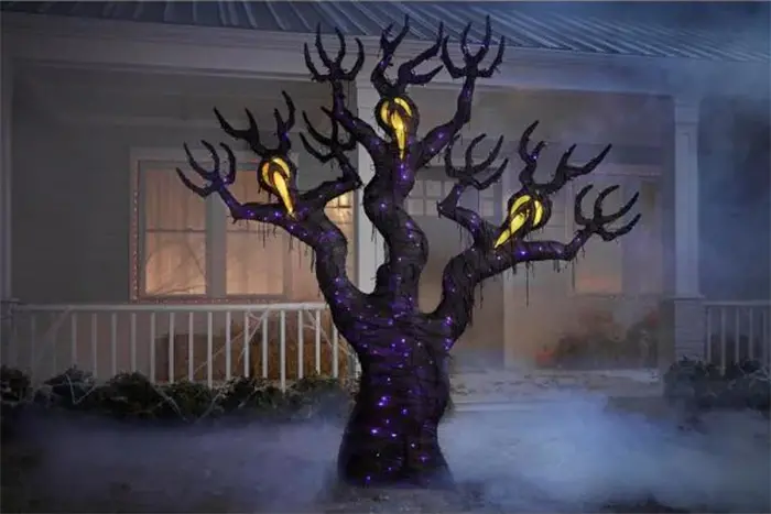 This creepy ghost tree has 260 warm white and purple LEDs to give it an eerie glow, setting a spine-chilling scene on your yard at night. It is made of durable tinsel with resilient metal frame. And comes with a metal base and pole to prop it up in place securely. Additionally, it has a weather-resistant coating to help it withstand the elements.