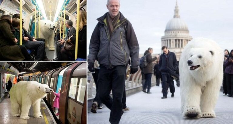 Imagine riding the subway to work in the morning and being faced with a polar bear. Scary, right? Well this is exactly what recently happened to early morning travelers in London. Thankfully the bear was animatronic although people must have taken a second look just to make sure! The incredibly realistic creature was given 'life' by two of the character actors from the celebrated West End show 'War Horse.'