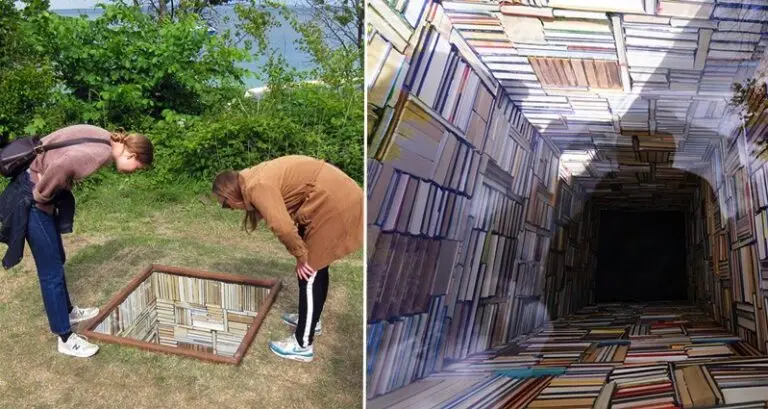If the idea of a bottomless library fulfills all your book nerd dreams, then you need to take a look at this excellent art installation. Conceived and created by Swedish artist Susanna Hesselberg, this piece is installed by the coast in Denmark as part of Aarhus' annual 'Sculpture by the Sea' contest and exhibition. This sculpture is built down into the ground, so that when you stand and look into its depths, it looks as though there's a library going all the way down into the center of the Earth and beyond. But, before you get too gleeful about the idea of an infinite library, you should know that it has a rather somber meaning behind it. The installation is called "When My Father Died It Was Like a Whole Library Had Burned Down" and Hesselberg created it to deal with her thoughts and feelings surrounding the loss of her father. The piece is rather beautiful, so let's take a look.