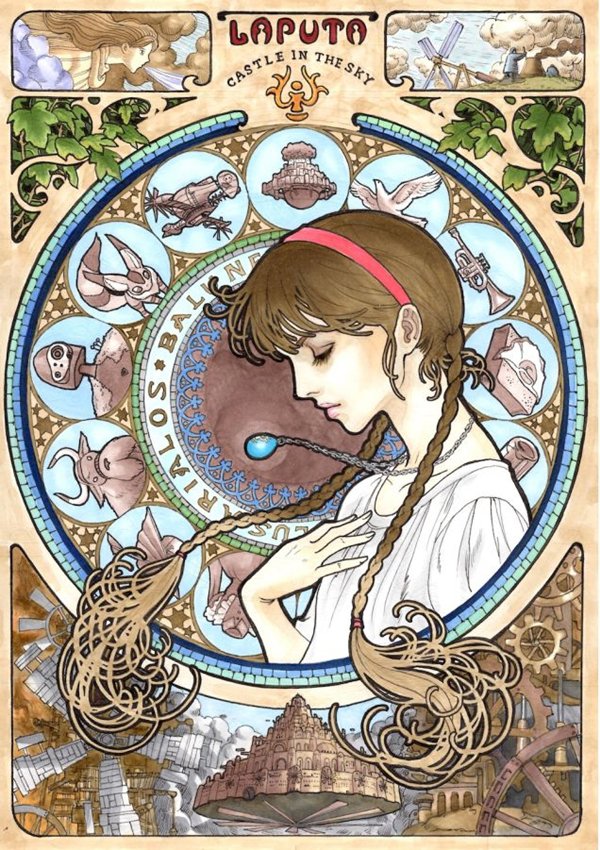 Unless you've been living under a rock, you've probably seen, or at least heard of, one of writer and animator Hayao Miyazaki's movies, even if you don't know him by name. He's the genius behind many of Japanese animation company Studio Ghibli's films, including the Oscar-winning Spirited Away, and other favorites such as Howl's Moving Castle, My Neighbor Totoro and Princess Mononoke. One Pixev user who goes by the name Marlboro has created some of the most gorgeous homages to the great man that we've ever seen. He's created character portraits in a beautiful Art Nouveau style not dissimilar to Alphonse Mucha. These really are stunning and would make incredible prints. Check them out!