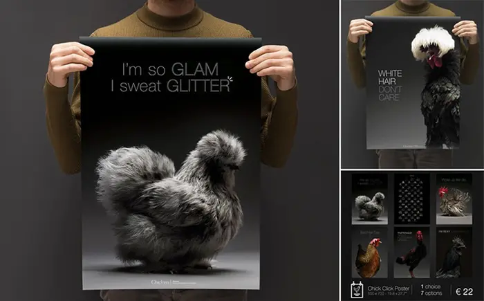 The Chic!ken chicken photobook features multitude diversity of these flightless birds. It includes impressive models such as the grey-feathered fluffy Silkie chicken named Agnes and the copper-feathered Frizzle bantam named Martha. The chicken photobook project gained over 2,000 backers on Kickstarter and it received a total of around $162,000. On July 2018, the chicken photobook was finally published and offered for sale in hardcover format.