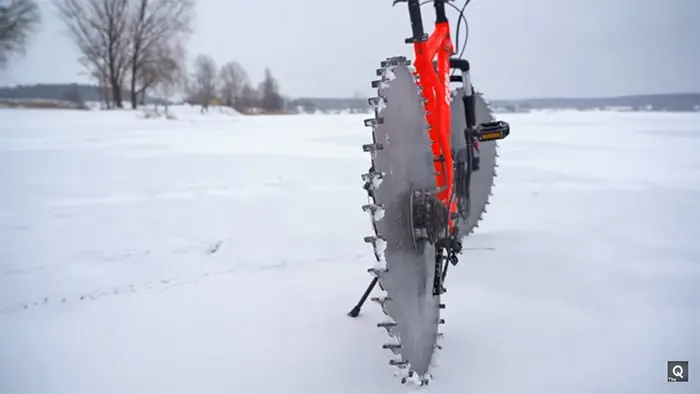 If you can recall, The Q is also the mastermind behind the hubless bike, a bicycle with spokeless wheels designed to make heads turn at every street. Now he’s at it again, revamping another one of his bikes to make cycling on ice possible. Apparently, we’re not used to cycling on snow and ice because regular bike wheels lack traction and grip on slippery ice. So, this ingenious engineer designed a bicycle with saw blade tires that can provide remarkable traction on snow and ice.