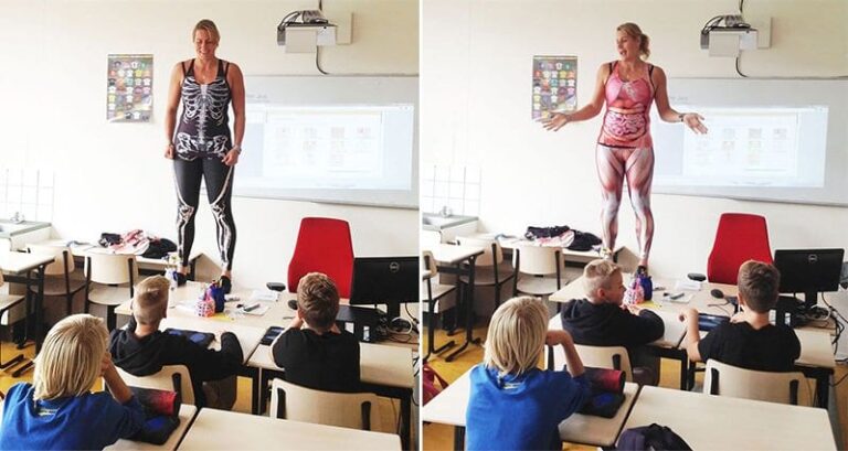 Biology teacher Debby Heerkens knows just how to make learning interactive and fun. The Netherlands based teacher who works at Groene Hart Rijnwoude school likes to strip off during lessons to reveal anatomically correct spandex suits! She has one which shows the location of muscles, another for organs, then finally, one which illustrates the location of all the bones in the human body. If only all Biology classes were as much fun. Take a look!