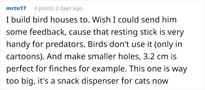 While the finished design look like a comfy abode for birds, some people raised some of their concerns about it