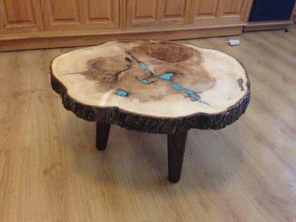 Turquoise and epoxy resin is added for some color and to protect the table top.