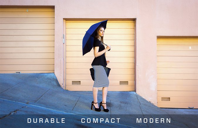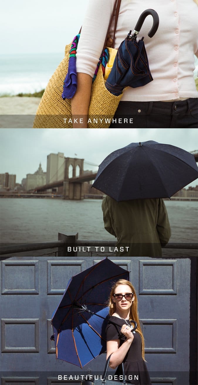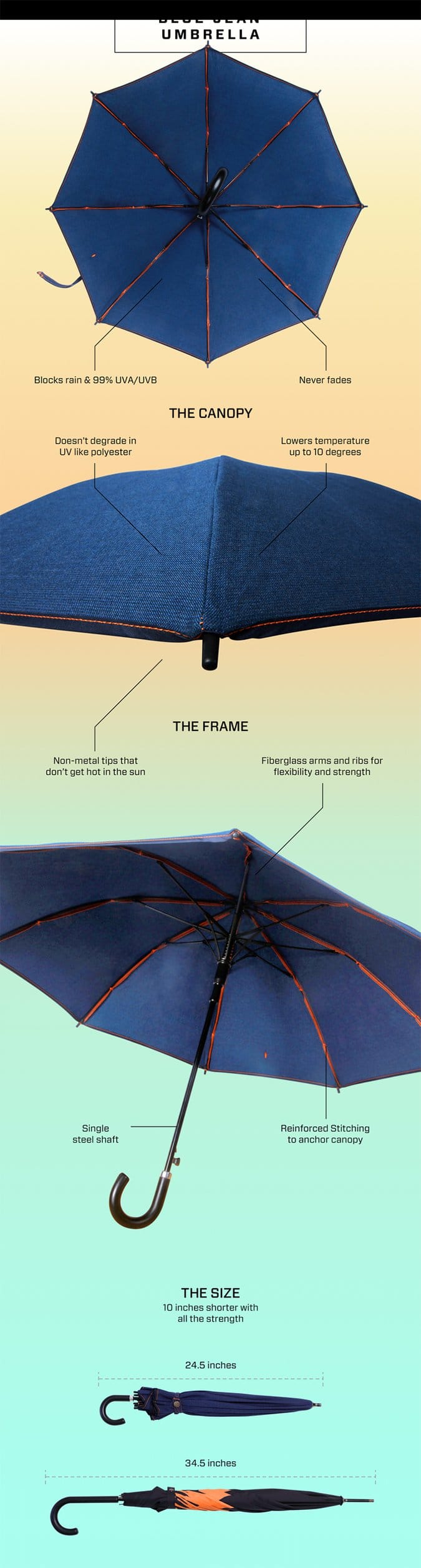 The 'Blue Jean Umbrella' is the first personal umbrella made from high-tech 'Sunbrella' fabric to block from both the rain and harmful UV rays. Due to it's state of the art fabric, the umbrella will not deteriorate, weaken or fade over time, even as it repels the rain and sun. With a sleek design, the umbrella would compliment any outfit! Check it out below!