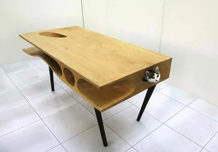 The CATable features passageways hidden inside the table that are accessed via holes big enough for cats to go down. Cats by nature are very curious animals, so they will love journeying down these unknown pathways and poke their heads out the other side. A lot of people don’t like their cats jumping on top of the table where they work or eat. Now that’s a thing of the past. While you work or enjoy your dinner, your cat won’t be jumping on top of the table leaving a mess, instead they will be jumping into the table. So you can eat your meal close to your pal.